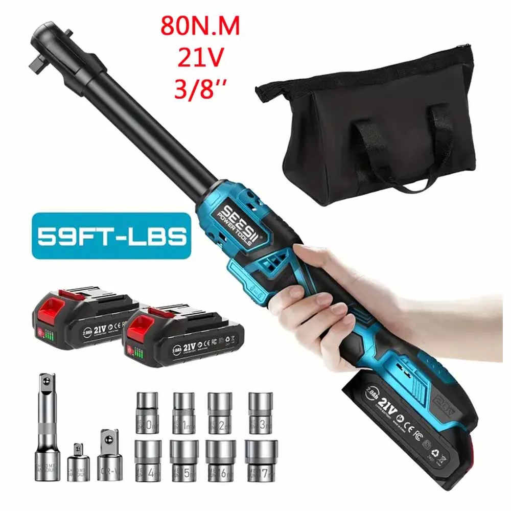 Your purchase includes one 3/8-inch extended cordless electric ratchet wrench, two 21V lithium-ion batteries, a battery charger, a 3-inch extension bar, adapters, and a set of eight commonly used sockets to get you started right away.