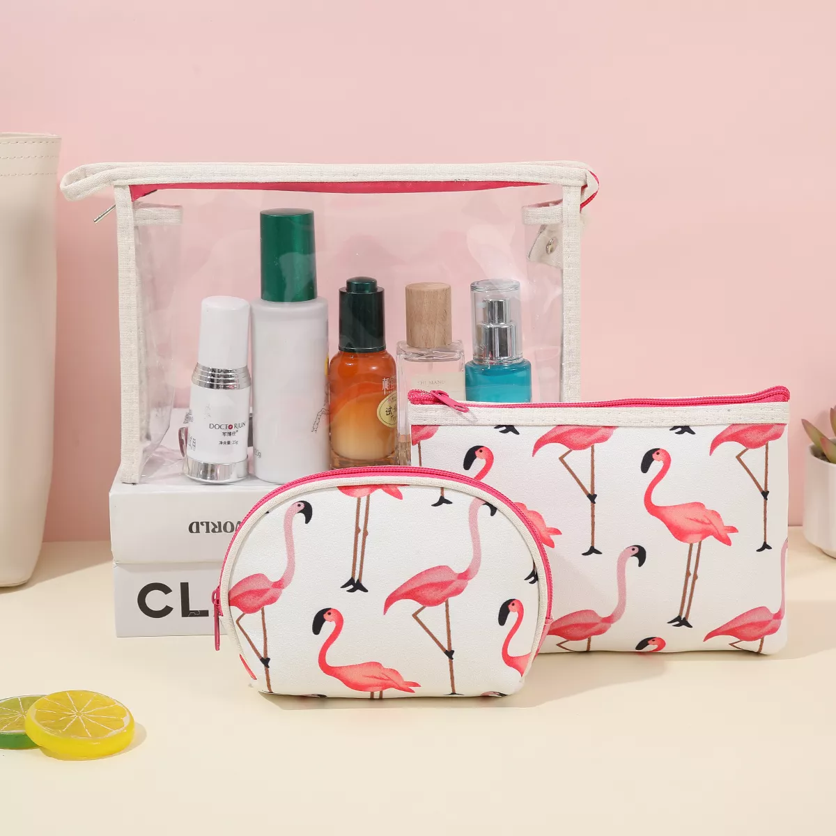 Brighten up your daily routine with this charming 3-piece flamingo makeup bag set. Designed with playful cartoon flamingo prints and crafted from high-quality waterproof transparent PVC, these bags combine style with practicality. Whether you’re getting ready at home or packing for a weekend trip, these organizers keep your essentials neat, visible, and protected.