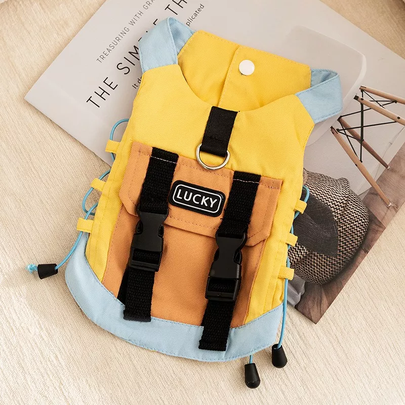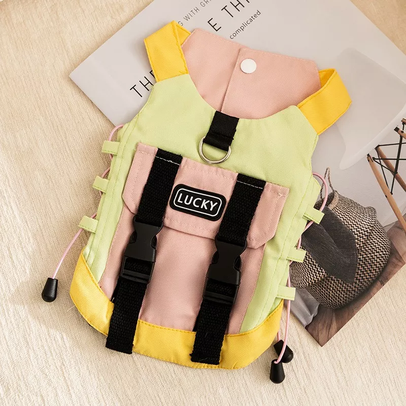 • Design: Open-buckle two-legged vest with cute backpack detail