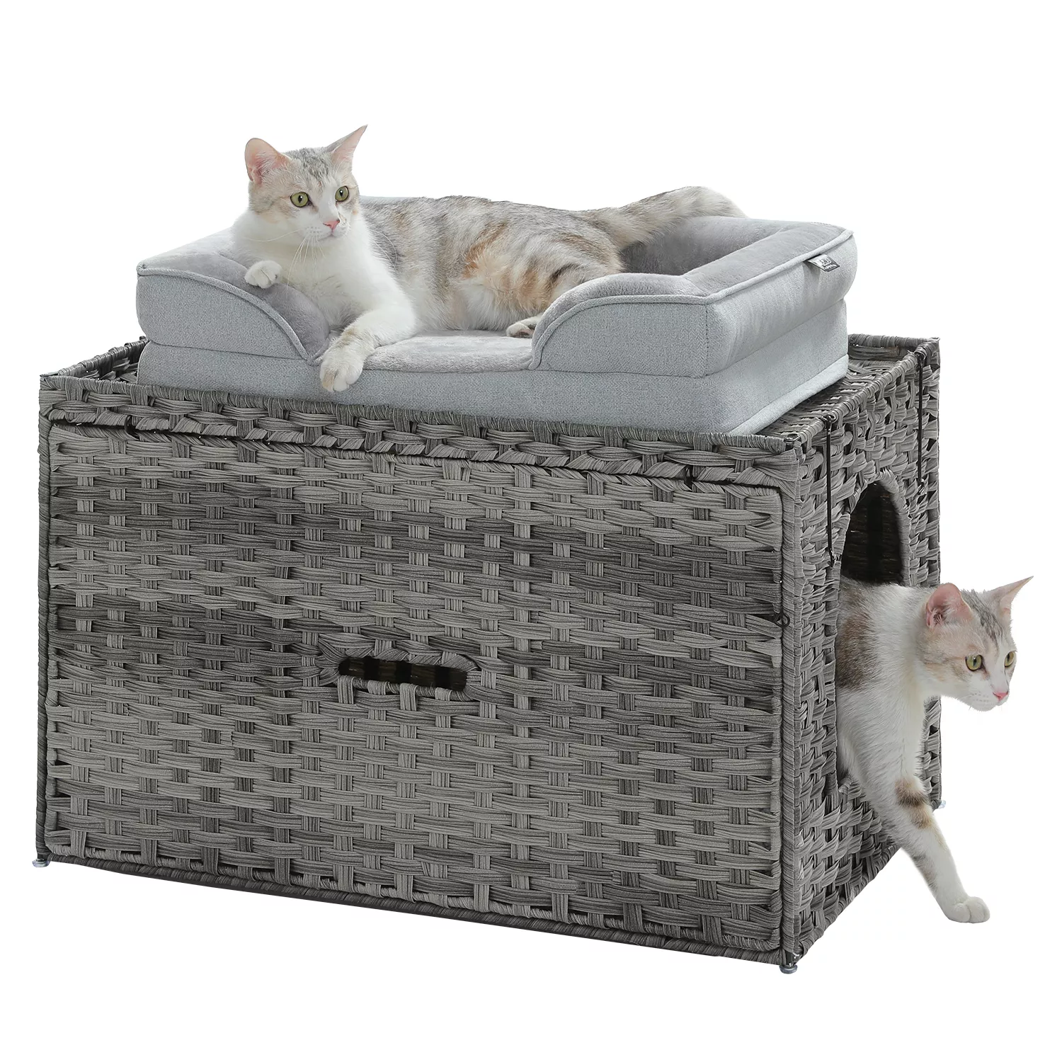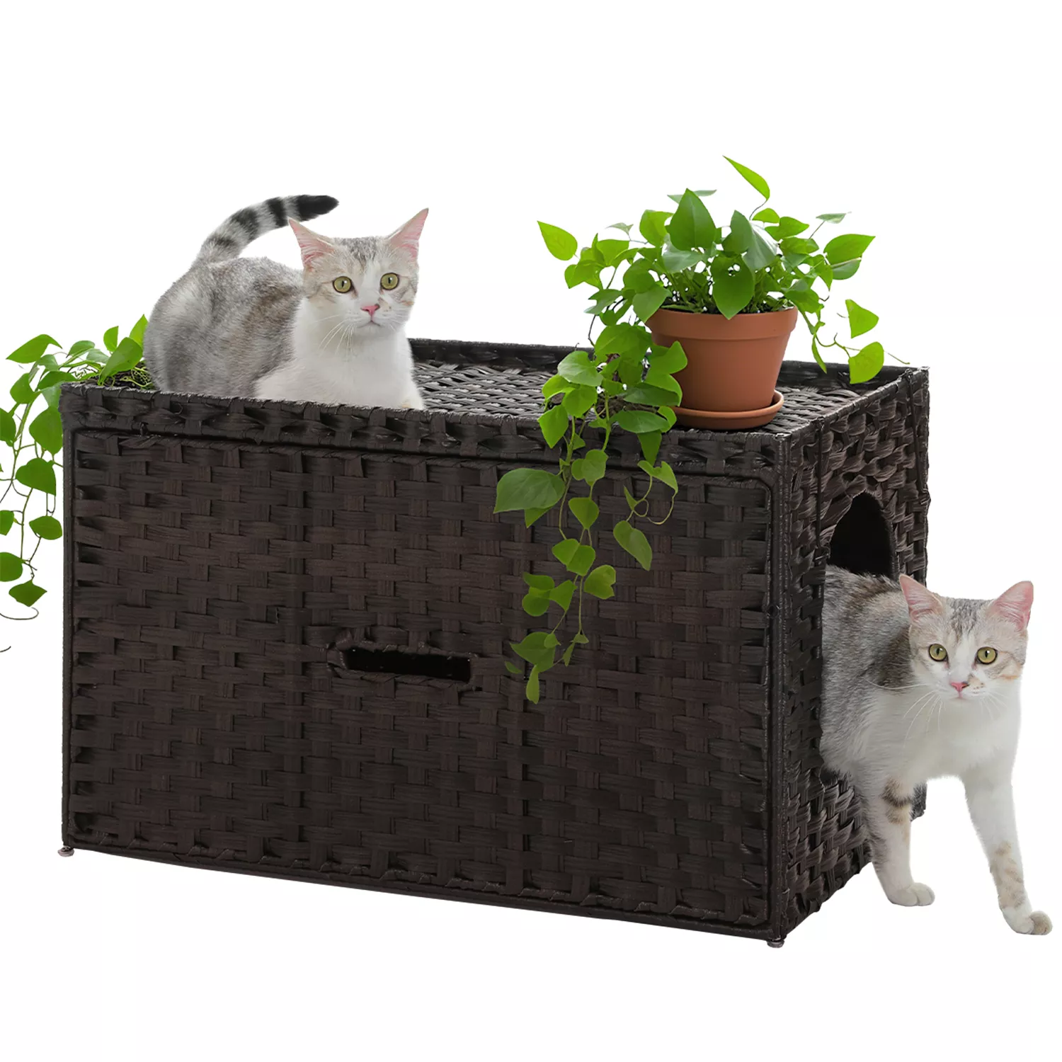 Handwoven Rattan Cat Litter Box Furniture with Door
