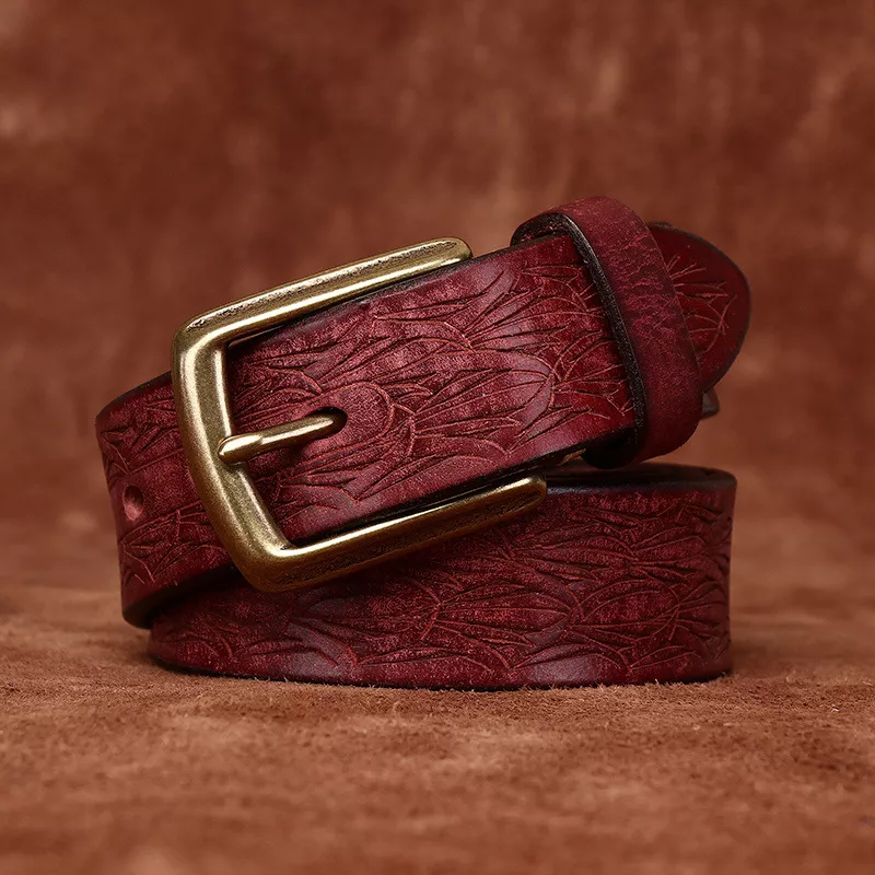Our belt features a sturdy 3.8 cm wide strap that provides a bold silhouette, perfect for holding up your favorite jeans. The copper buckle, measuring 6 cm in length, adds a sophisticated touch, setting this belt apart from ordinary options. The rich texture of the thick cowhide leather not only looks stylish but also feels great against the waist. This belt is versatile enough to transition seamlessly from casual outings to work events, making it a staple in your wardrobe.