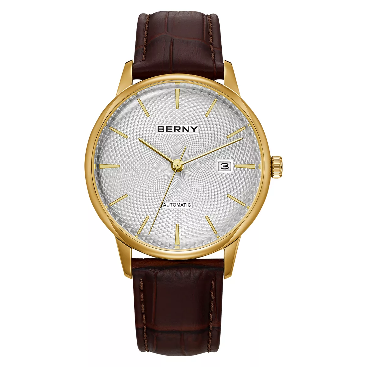 Elevate your style with this luxury gold automatic dress watch, designed for men who appreciate fine craftsmanship and refined details. With its sleek round case, domed glass, and clean hour markers, this timepiece brings together elegance and precision in one remarkable accessory. Whether you’re heading to an important business meeting, attending a formal occasion, or simply looking to enhance your everyday look, this watch ensures you make a lasting impression.