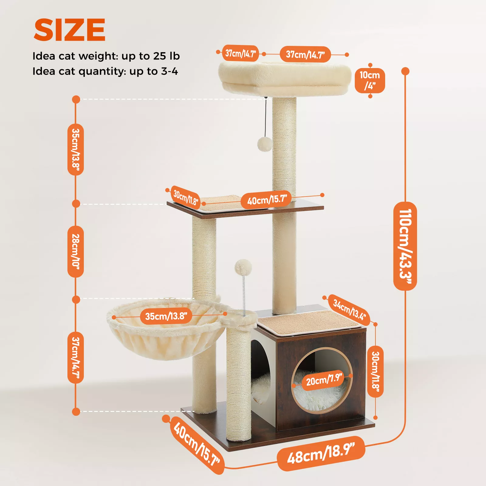 Best used as a daily activity center, this cat tree is ideal for single or multiple cats in need of exercise, enrichment, and comfort. Its space-saving design (18.9 in length × 15.6 in width) means it won’t take over your home while still offering endless fun for your furry friend. Place it in your living room, bedroom, or balcony, and watch your cat enjoy their very own kingdom.