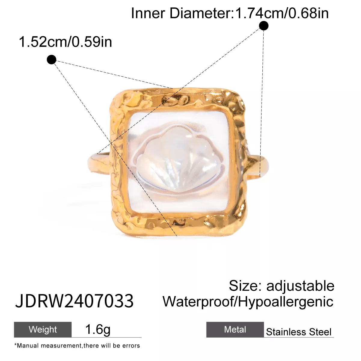 Made from high-quality stainless steel and finished with a luxurious 18K gold plating, this ring offers long-lasting shine and durability. The open-end design is adorned with a natural shell accent, creating a unique oval-square silhouette that feels both vintage and contemporary. At just 0.06 oz, it is lightweight and comfortable for all-day wear.