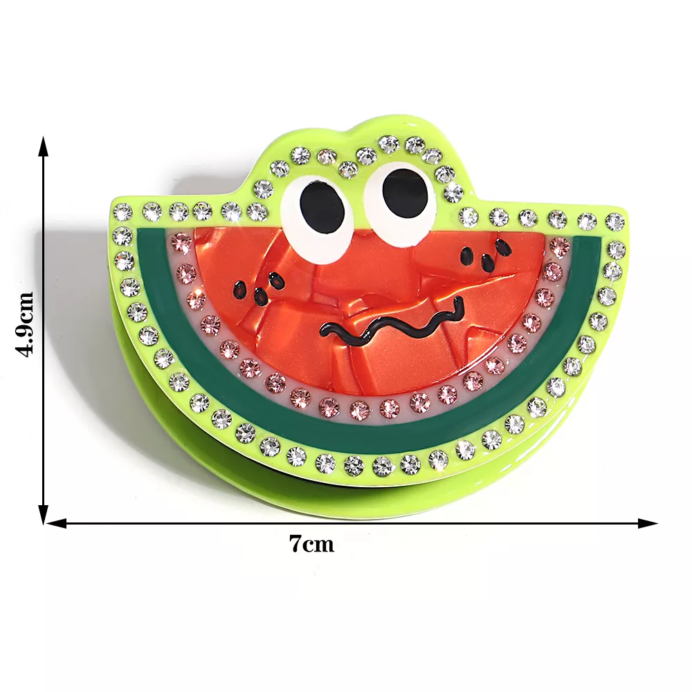 This hair clip is special because it combines playful emoji culture with genuine sparkle. The vibrant green and pink watermelon design looks exactly like the beloved emoji we all use, but with an extra layer of luxury thanks to the genuine cubic zirconia “seeds.” What makes it truly special is the attention to detail—each “seed” is carefully placed to mimic the random pattern of a real watermelon, creating a design that’s both fun and sophisticated. The high-quality acrylic maintains its bright colors through sun exposure and summer activities, while the strong claw mechanism keeps your style secure. It’s this combination of pop culture relevance, quality materials, and unexpected elegance that makes it exceptional.